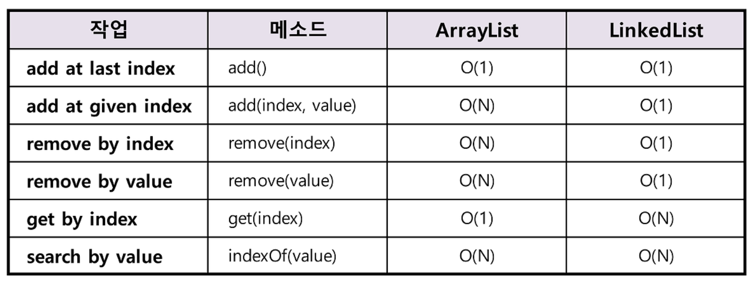 = 순차적으로 추가하기 = ArrayList : 126ms LinkedList : 171ms = 중간에 추가하기 = ArrayList : 1695ms LinkedList : 10ms = 중간에서 삭제하기 = ArrayList : 1303ms LinkedList : 122ms = 순차적으로 삭제하기 = ArrayList : 8ms LinkedList : 23ms성능 차이 분석