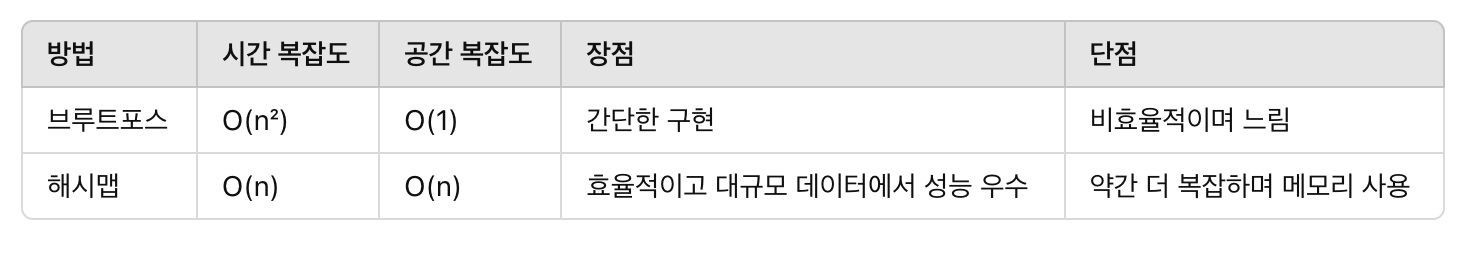- 단점: 약간 더 복잡한 로직과 메모리 사용량 증가(HashMap 저장).